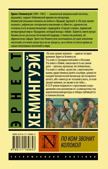 "По ком звонит колокол" — один из лучших романов Эрнеста Хемингуэя. Эта книга о гражданской войне в Испании. Эта книга о Войне, какая она есть на самом деле — грязная, кровавая, бесчеловечная… Эта книга о любви, мужестве, самопожертвовании, нравственном долге и выборе, ценности каждой человеческой жизни как части единого целого, ибо "никогда не посылай узнать по ком звонит колокол, он звонит и по тебе"… В СССР роман издавался с серьезными сокращениями и искажениями из-за вмешательства идеологической цензуры и теперь публикуется в полном объеме.