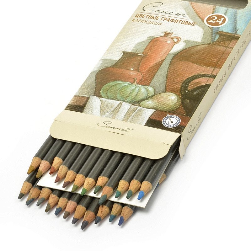 Цветные графитовые карандаши "Сонет" разработаны специально для дизайнеров и профессиональных художников. Они могут использоваться для живописи, рисования, работы в смешанных техниках. При работе сухим карандашом Вы получите нежные оттенки цветного графита, но при добавлении воды рисунок преобразится всем богатством ярких, насыщенных цветов. Ударопрочные грифели карандашей содержат насыщенные пигменты с высокой светостойкостью.
