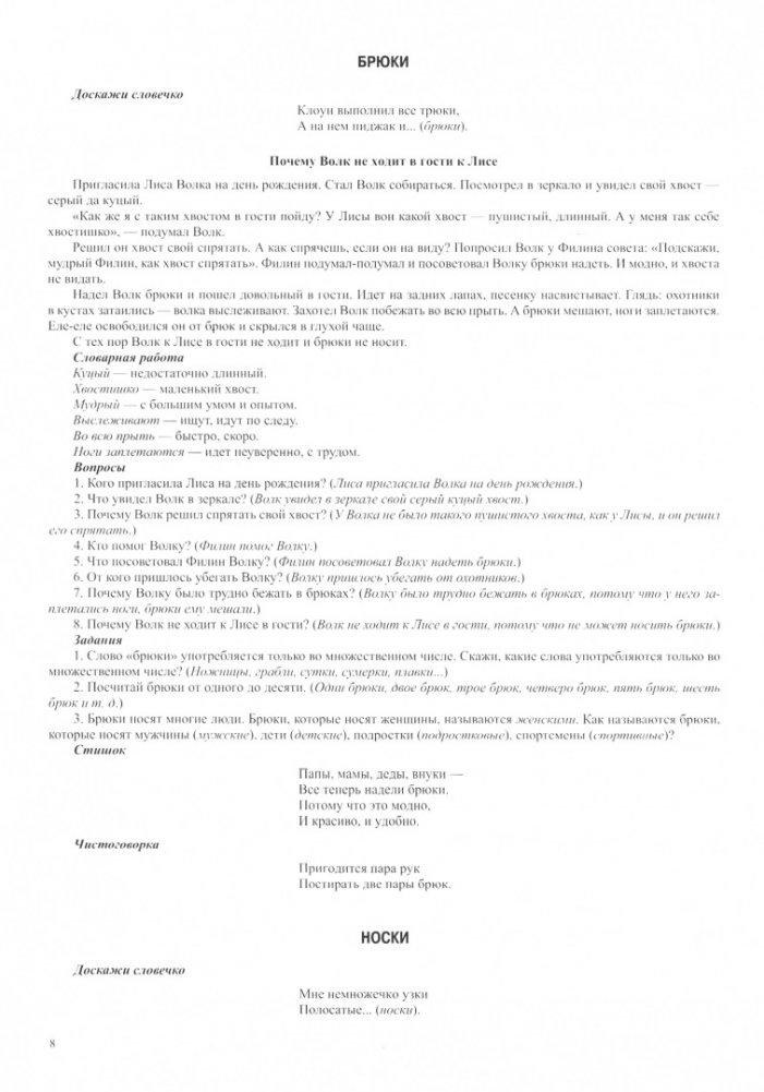 Материал, представленный в пособии, позволит обогатить и расширить словарный запас детей. Научит пользоваться существительными, прилагательными, глаголами, наречиями. В книге много авторских сказок, загадок, стихотворений, чистоговорок, занимательных заданий, потешек, игр по лексической теме «Одежда». На вклейке даны цветные предметные картинки, картинки для раскрашивания (обводки, штриховки), а также сюжетная картина.