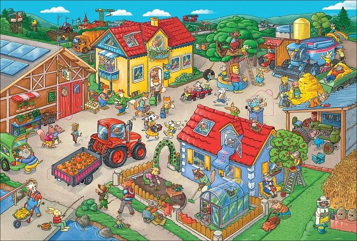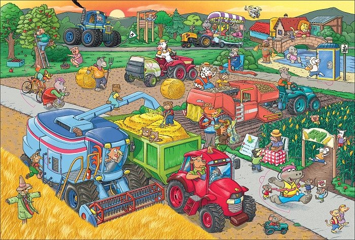 Здесь столько интересных занятий! Посмотри: можно косить сено, собирать в саду свежие фрукты, запускать воздушного змея и даже починить трактор!