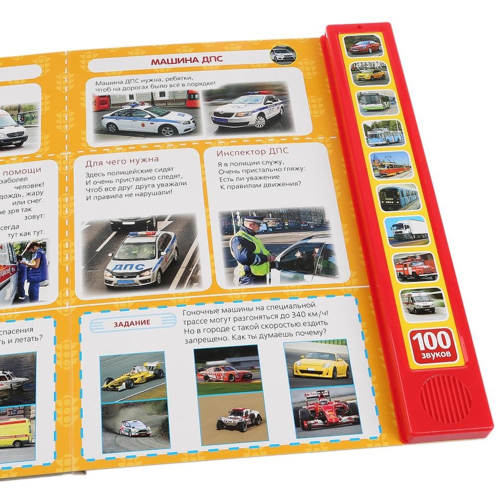 - книжка с "изюминкой" сразу привлечёт внимание: 10 звуковых кнопок на обложке при нажатии порадуют вас и ребёнка 100 звуками машин!