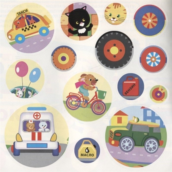 Внутри книжки лист с наклейками, с их помощью можно дополнить каждую картинку деталями, предметами или персонажами -надо только проявить фантазию.
