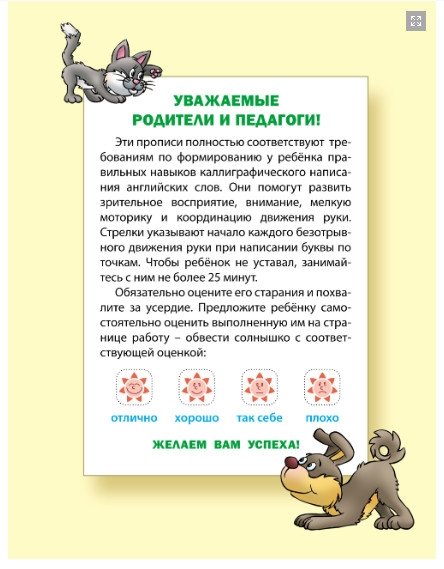 Эти прописи полностью соответствуют требованиям по формированию у ребенка правильных навыков каллиграфического написания английских слов. Они помогут развить зрительное восприятие, внимание, мелкую моторику и координацию движения руки. Стрелки указывают начало каждого безотрывного движения руки при написании буквы по точкам.