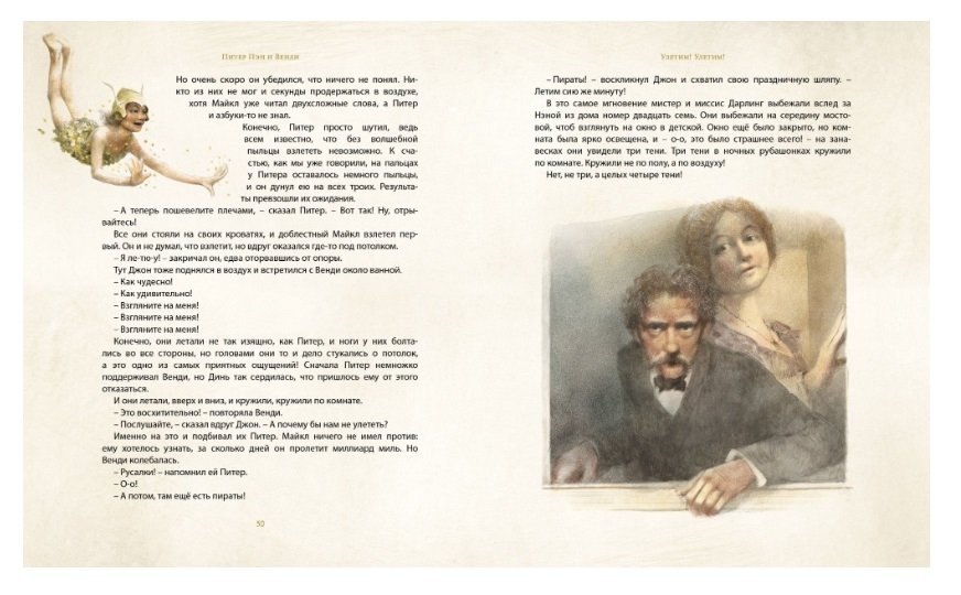Удивительная история о сказочном мальчике, который не хотел взрослеть, давно поразила воображение детей и взрослых. Она началась с того, что однажды Питер Пэн влетел в окно детской в доме, где жили девочка Венди и двое её братьев. Вместе с Питером они отправились на далёкий волшебный остров. Там им встретились русалки, храбрые индейцы, озорная фея и даже пираты с их злобным главарём капитаном Крюком, судьба которого окажется в руках летающего мальчика. И тут героев ждут захватывающие приключения. Этой знаменитой книге особое очарование придают великолепные иллюстрации, созданные выдающимся художником к столетию первого издания «Питера Пэна».