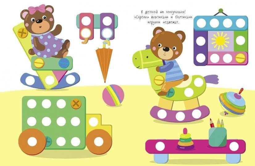 Уважаемые взрослые! В этой книге 198 наклеек - разноцветных винтиков и болтиков! Малыш должен дополнить с их помощью картинки. Это очень просто: покажите ему, что наклейку нужно приклеить на белый кружочек. Обратите внимание малыша на то, что в первую очередь нужно приклеить детали, которые скрепляют элементы конструкций между собой. Если с первой попытки приклеить ровно не получилось - не беда, ведь наши наклейки многоразовые.