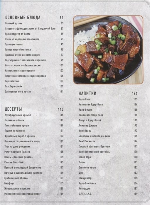 Кулинарная книга по легендарной серии игр Fallout! Давно мечтали выпить бутылочку Ядер-колы или съесть Пюре быстрого приготовления (ладно, чуть менее быстрого, чем из Супермарта)? Открывайте нужную страницу и принимайтесь за дело! Да, не забудьте принять Антирадин после трапезы — его рецепт вы тоже найдете в этой книге.