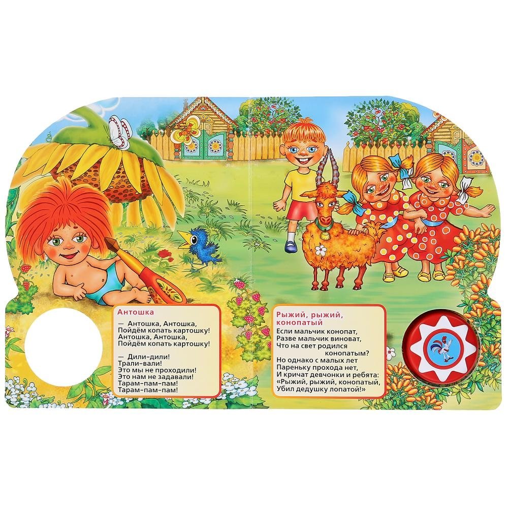 Компактная книга из прочного безопасного картона с кнопкой для прослушивания. Любимые авторы, народные фольклор, истории по мультфильма, и конечно, 10 песен!