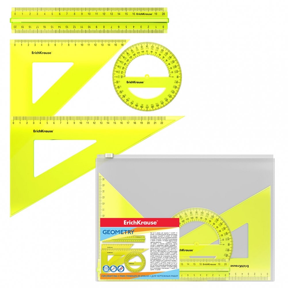 Набор геометрический большой: линейка 20 см с держателем; угольник 16 см/45 градусов; угольник 22 см/60 градусов; транспортир 360 градусов.