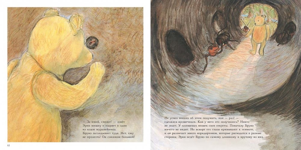 В первой истории мишка Бруно гуляет по лесу, где знакомится с муравьем Эриком, который приглашает мишку заглянуть к нему домой, в муравейник. Любознательный мишка, когда захочет, может делаться маленьким. Как? Это его секрет! Став размером с муравья, мишка ныряет в один из ходов муравейника и узнает о том, как живет многочисленное муравьиное сообщество. Потом за ним прибегает его подруга собака Лолла и вместе они идут смотреть, как муравьи пасут тлей и добывают сладкий сироп. Свои наблюдения мишка потом аккуратно заносит в дневник. Мишкины записки и рисунки занимают четыре страницы: муравейник в разрезе, муравьиные «профессии», еда муравьев, их друзья и враги, а также другие интересные сведения о жизни муравьев.