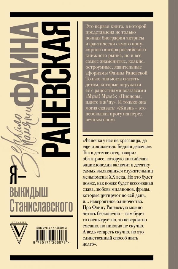 "Чтобы получить признание – надо, даже необходимо, умереть" – говорила Фаина Георгиевна Раневская. Надо, но не ей. Она никогда не стеснялась в выражениях. Остроумие Раневской сродни рефлексу – оно непроизвольное. Среди сотни книг о Фаине Раневской – в этих "Записках…" собраны не только ее лучшие афоризмы и цитаты, которые складываются в полноценную историю ее жизни, но и воспоминания о самых известных людях той эпохи: Анне Ахматовой, с которой Раневская вместе пережила эвакуацию, Ростиславе Плятте, Ольге Аросевой и многих, многих других…