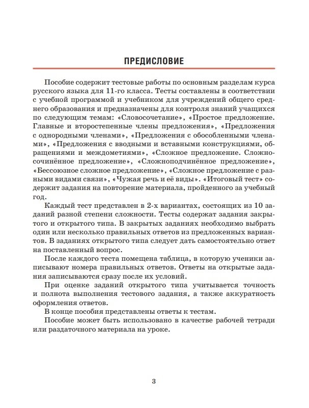 Пособие представляет собой сборник тестовых заданий по основным разделам курса русского языка, изучаемого в 11 классе. Тесты составлены в соответствии с учебной программой и учебником для учреждений общего среднего образования. Итоговый тест содержит задания на повторение материала, пройденного за весь учебный год.