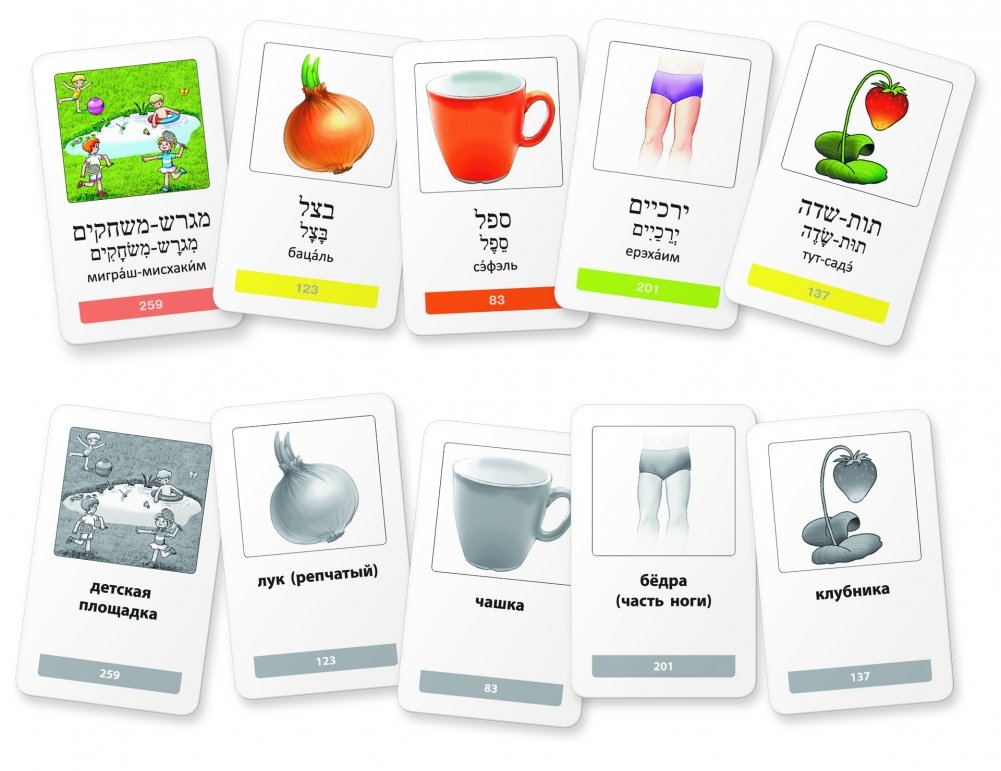 Комплект карточек предназначен для начинающих изучать иврит. На карточках размещены наиболее употребимые слова на иврите, относящиеся к базовой лексике. Все слова разделены на тематические блоки, сопровождаются занимательными иллюстрациями и транскрипцией. Предлагаемая методика запоминания основана на связи иврита и русского слова через картинку. Это позволяет выучить быстро и эффективно большое количество новых слов.