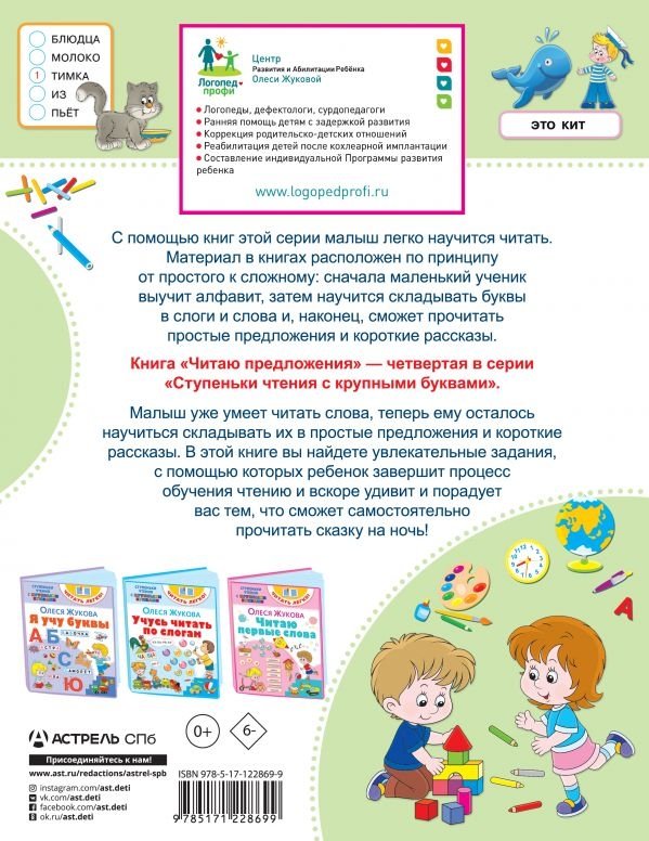 Книга "Читаю предложения" – четвертая в серии "Ступеньки чтения с крупными буквами". Малыш уже умеет читать слова, теперь ему осталось научиться складывать их в простые предложения и короткие рассказы. В этой книге вы найдете увлекательные задания, с помощью которых ребенок завершит процесс обучения чтению и вскоре удивит и порадует вас тем, что сможет самостоятельно прочитать сказку на ночь!