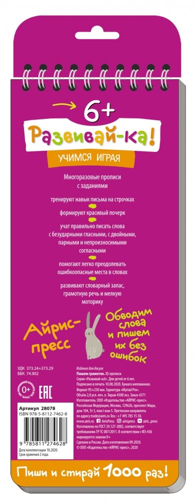 Многоразовые иллюстрированные прописи помогут ребёнку освоить грамотное написание словарных слов, слов с безударными гласными, с двойными согласными, с парными и непроизносимыми согласными. Благодаря специально подобранным заданиям и непринуждённой тренировке ребёнок научится легко преодолевать ошибкоопасные места в словах. Причем в этих прописях можно писать и стирать много раз, не боясь сделать ошибку. В процессе работы с прописями у ребёнка формируется красивый почерк, развивается словарный запас (в прописях дано несколько сотен слов), грамотная речь и мелкая моторика.