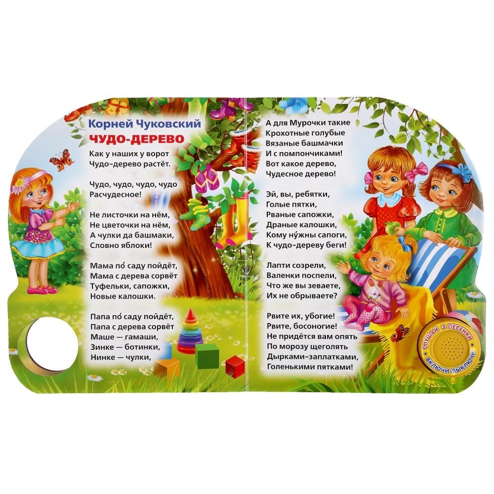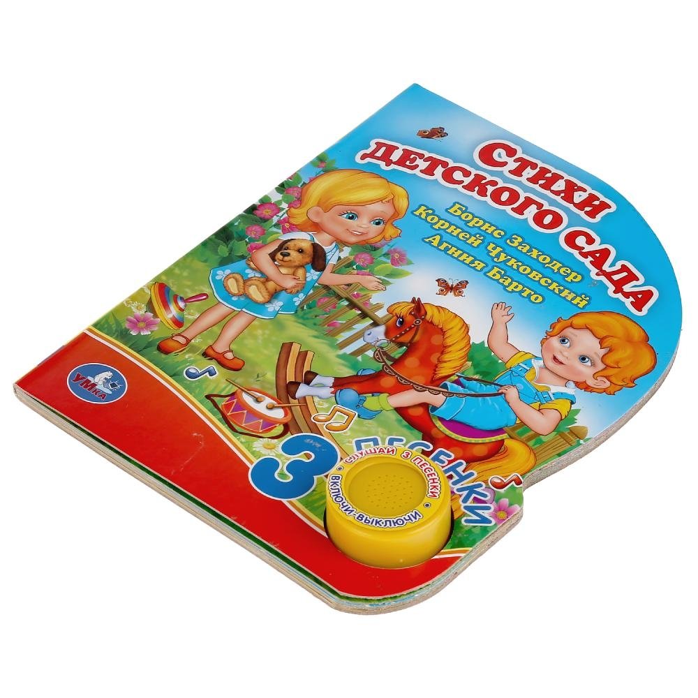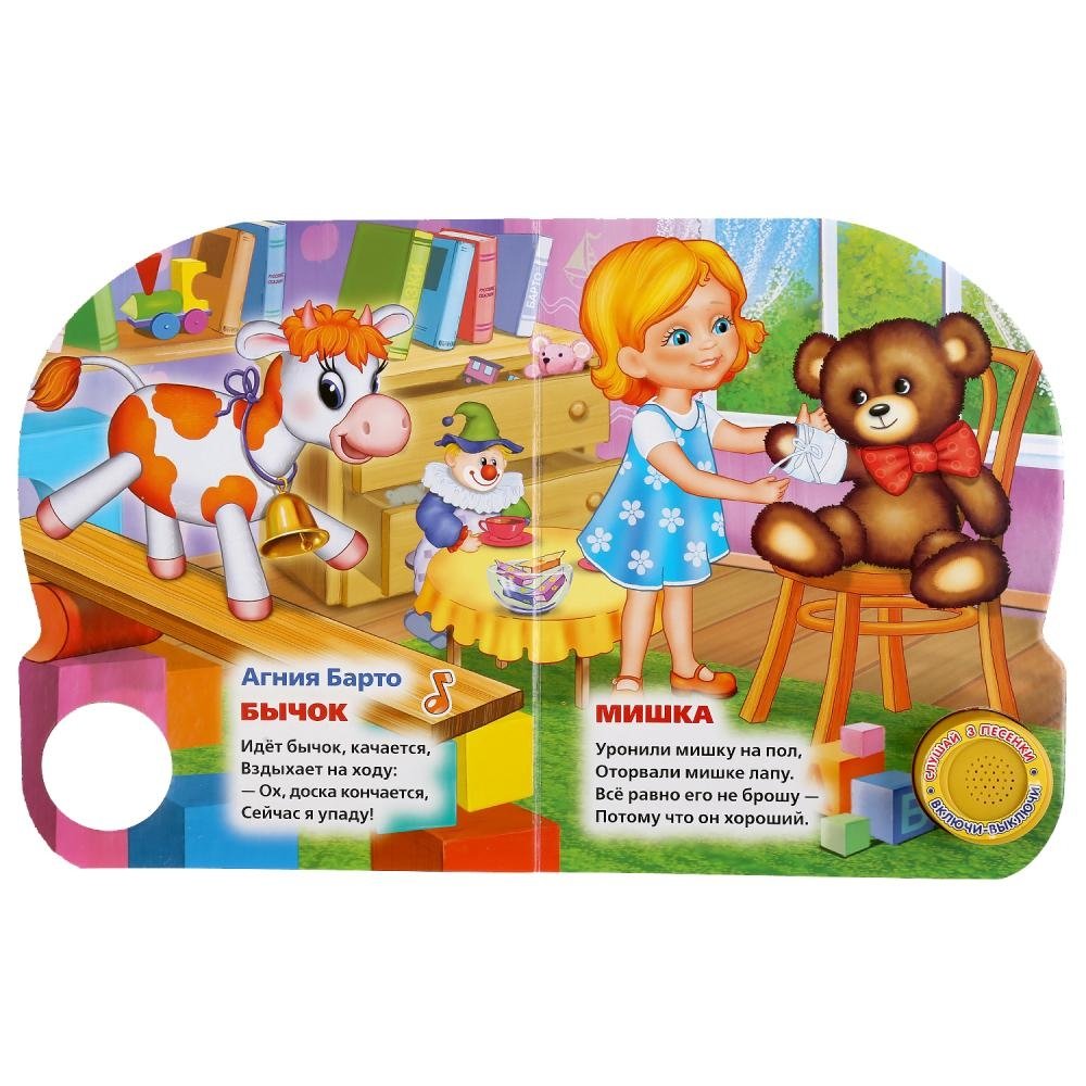 Компактная книга из прочного безопасного картона с кнопкой для прослушивания. Любимые авторы, народные фольклор, истории по мультфильма, и конечно, 3 песенки!