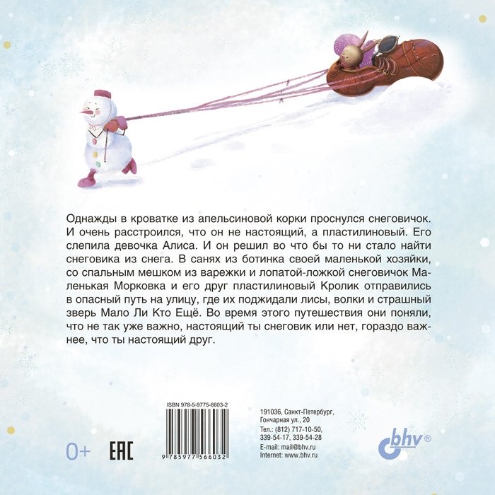 Уютная зимняя история о снеговичке, который однажды проснулся и очень расстроился, что он не настоящий, а пластилиновый. Его слепила девочка Алиса. И он решил во что бы то ни стало найти снеговика из снега. В санях из ботинка своей маленькой хозяйки, со спальным мешком из варежки и лопатой-ложкой снеговичок Маленькая Морковка и его друг пластилиновый Кролик отправились в опасный путь на улицу, где их поджидали лисы, волки и страшный зверь Мало Ли Кто Ещё. Во время этого путешествия они поняли, что не так уж важно, настоящий ты снеговик или нет, гораздо важнее, что ты настоящий друг.