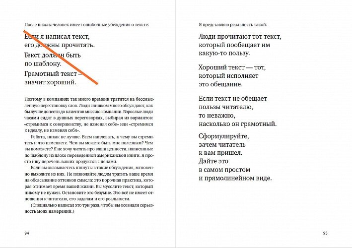 Вы найдете в книге более 50 инструментов улучшения текста. В разделе «Контекст» автор покажет, как справиться с предвзятостью читателей и настроить их на верное восприятие информации. В разделе «Интерес» — как превратить скучный текст в увлекательный, не меняя его содержания. Раздел «Текст» посвящен использованию примеров, антипримеров, аналогий, метафор, сюжетности и слоганов — тому, что поможет адресату правильно понять написанное вами. В разделе «Подача» представлены инструменты мгновенного воздействия: как донести главное заголовком, схемой или фотографией.