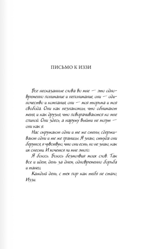 Семнадцатилетняя Ханна перестала говорить после гибели сестры-близняшки. Ханне кажется, что вместе с Иззи она потеряла часть самой себя. Чтобы облегчить свою боль, она каждый день пишет письма Иззи, а потом сжигает их. Родители отправляют Ханну в школу-интернат для подростков, которые получили психологическую травму. Там она знакомится с Сарой и симпатичным парнем Леви. Для Ханны это шанс отпустить прошлое и снова обрести себя. Но как сделать шаг навстречу новой жизни, когда не можешь вымолвить ни слова?