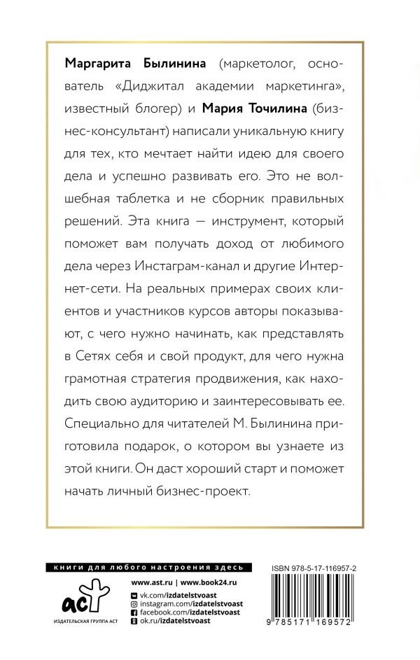 Маргарита Былинина (маркетолог, основатель "Диджитал академии маркетинга", известный блогер) и Мария Точилина (бизнес-консультант) написали уникальную книгу для тех, кто мечтает найти идею для своего дела и успешно развивать его. Это не волшебная таблетка и не сборник правильных решений. Эта книга — инструмент, который поможет вам получать доход от любимого дела через Инстаграм-канал и другие Интернет-сети. На реальных примерах своих клиентов и участников курсов авторы показывают, с чего нужно начинать, как представлять в Сетях себя и свой продукт, для чего нужна грамотная стратегия продвижения, как находить свою аудиторию и заинтересовывать ее. Специально для читателей М. Былинина приготовила подарок, о котором вы узнаете из этой книги. Он даст хороший старт и поможет начать личный бизнес-проект.