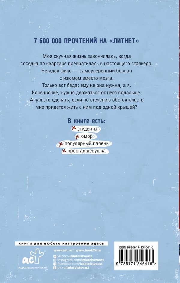 Моя скучная жизнь закончилась, когда соседка по квартире превратилась в настоящего сталкера. Ее идея фикс — самоуверенный болван с изюмом вместо мозга. Только вот беда: ему не она нужна, а я. Конечно же, нужно держаться от него подальше. А как это сделать, если по стечению обстоятельств мне придется жить с ним под одной крышей?