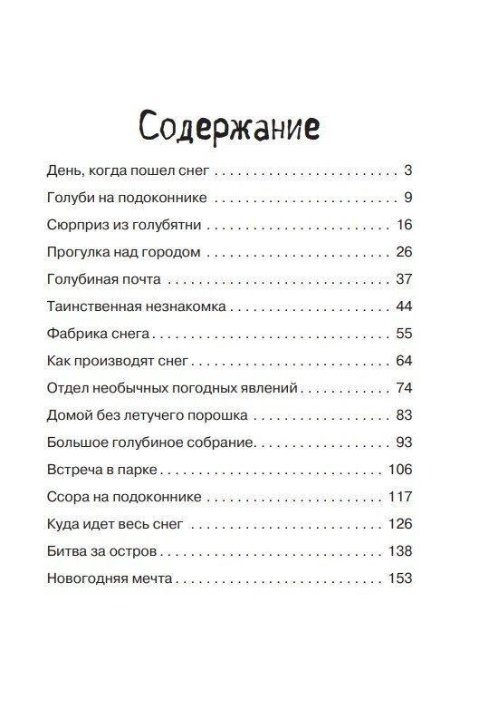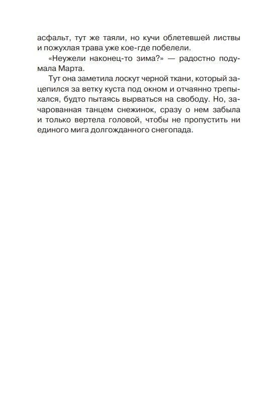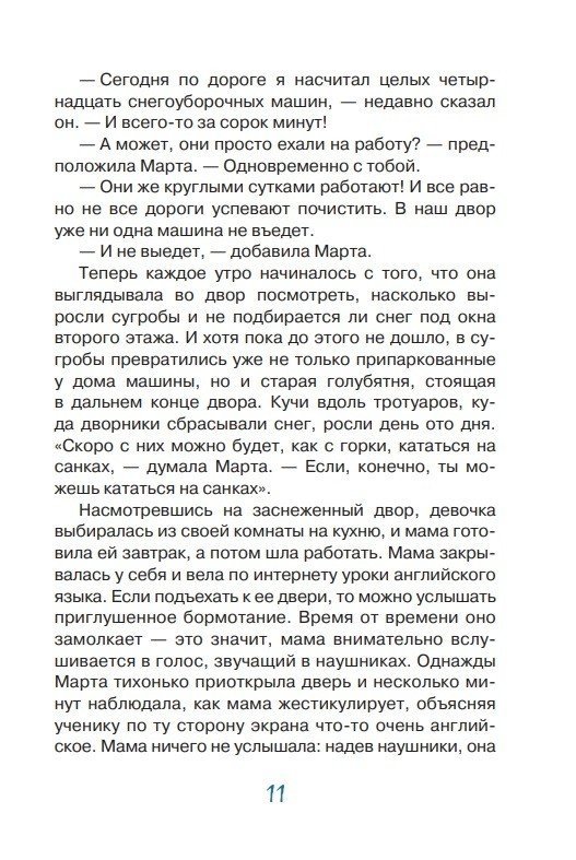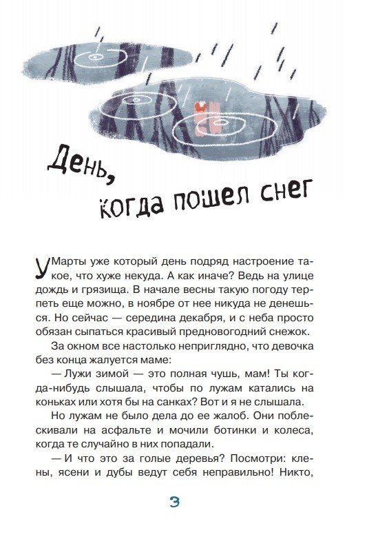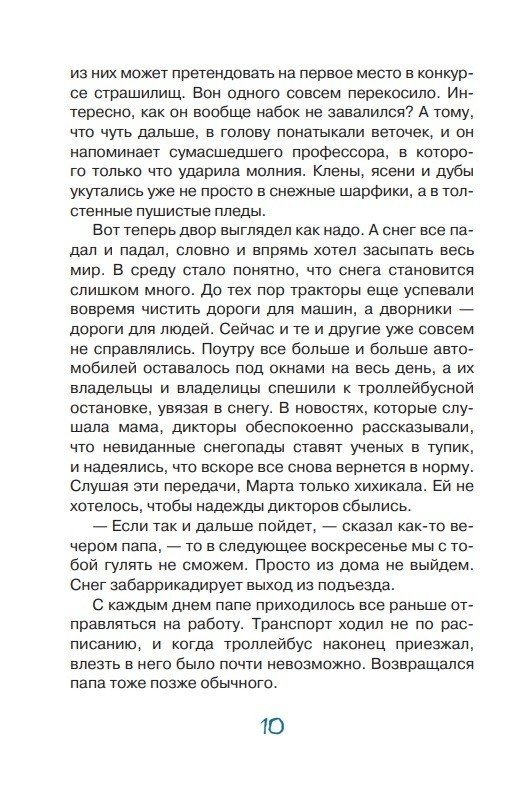 Марте так хочется лепить снеговиков и играть в снежки! Но зима запаздывает, и на улице — только лужи и грязища. Ясно, что вешать нос не стоит, ведь если очень сильно о чём-то мечтаешь, то мечта обязательно сбудется. Вот только иногда это приводит к неожиданным последствиям… Когда в городе начинается невиданный снегопад, Марта и её новые друзья должны разобраться, кто или что за этим стоит. И запомни: голуби на подоконнике — примета того, что тебя ждут невероятные приключения.
