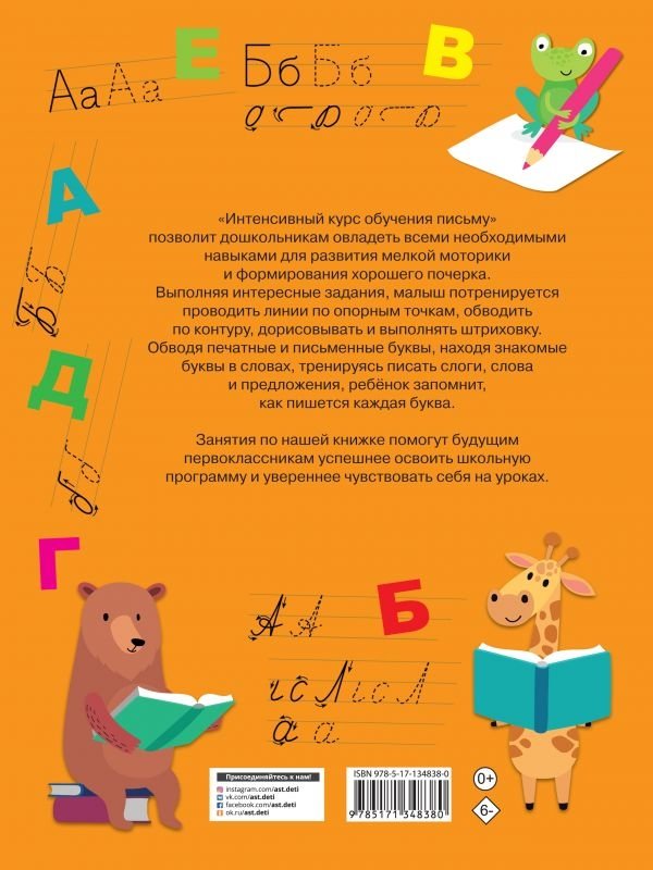 Выполняя разнообразные задания пособия "Интенсивный курс обучения письму", ребёнок не только познакомится с печатными и письменными буквами, научится правильно их писать, разовьёт графические навыки и мелкую моторику, но и научится внимательности, аккуратности и самостоятельности, приобретёт навыки, необходимые для успешного обучения в школе. Плотная белая бумага позволит использовать ручки, карандаши и даже фломастеры, а яркие иллюстрации сделают обучение письму интересным и увлекательным.