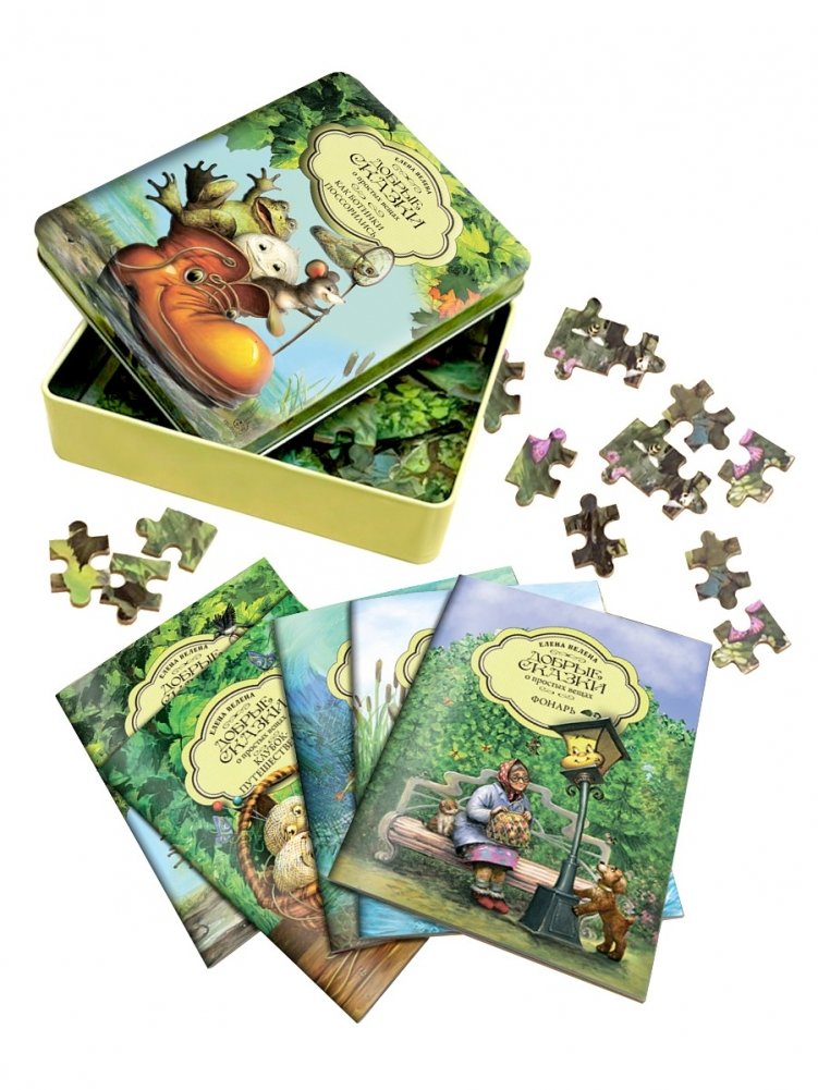 Набор в жестяной коробочке "Как ботинки поссорились": 5 мини-книг. Пазл (60 деталей)