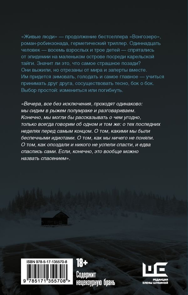"Живые люди" — продолжение бестселлера "Вонгозеро", роман-робинзонада, герметический триллер. Одиннадцать человек — восемь взрослых и трое детей — спрятались от эпидемии на маленьком острове посреди карельской тайги. Значит ли это, что самое страшное позади? Они выжили, но отрезаны от мира и заперты вместе. Им придется зимовать, голодать и самое главное — учиться принимать друг друга, сосуществовать тесно, бок о бок. Выбор простой: измениться или погибнуть.