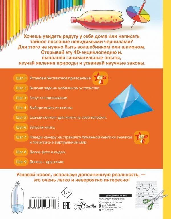 Эта книга предлагает тебе познакомиться с окружающим миром и разобраться в научных законах экспериментальным путем. За ходом опытов ты можешь наблюдать прямо на этих страницах, ведь это не обычная книга, а 4D-издание! Читай, смотри обучающие видео, проводи опыты, слушай познавательные аудиозаписи. Элементы дополненной реальности обязательно помогу новым знаниям запомниться надолго.