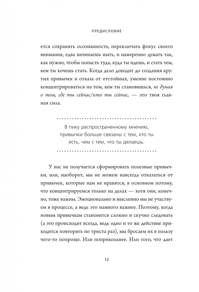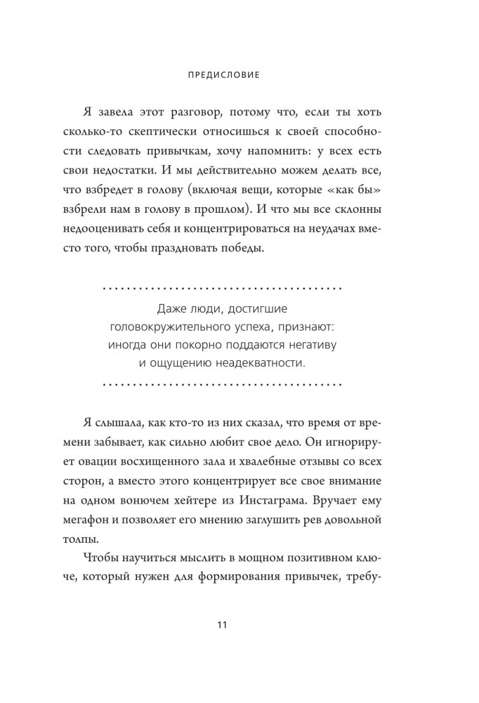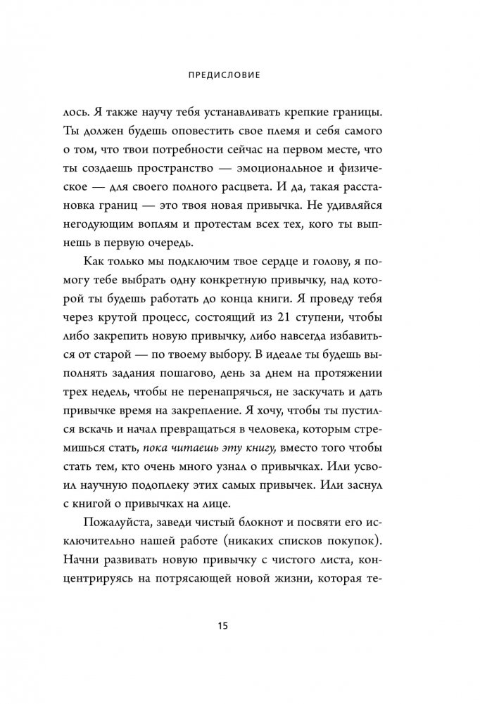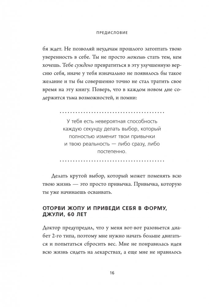 Любовь к луковым кольцам и жареному мясу не помешала Джен Синсеро написать одну из самых гениальных книг про привычки. Можно долго пытаться, но так и не научиться вставать в пять утра, делать зарядку и использовать зубную нить. Однако феноменальный талант автора этой книги запускает мощный трансформационный процесс: вы сами не замечаете, как начинают меняться ваши ежедневные действия и мысли. Эта книга — 21-дневный марафон по замене плохих привычек хорошими. Он работает по принципу снежного кома: каждый день вы вводите новое для себя упражнение и продолжаете выполнять его до конца отведенного срока. В результате не только перестраиваете свою жизнь, но и получаете бешеный заряд энергии. А еще прекращаете ругать себя за маленькие слабости.