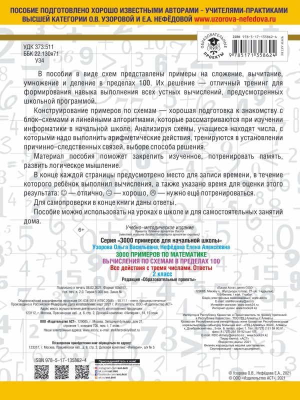 В пособии в виде схем представлены примеры на сложение, вычитание, умножение и деление в пределах 100. Их решение - отличный тренинг для формирования навыка выполнения всех устных вычислений, предусмотренных школьной программой.