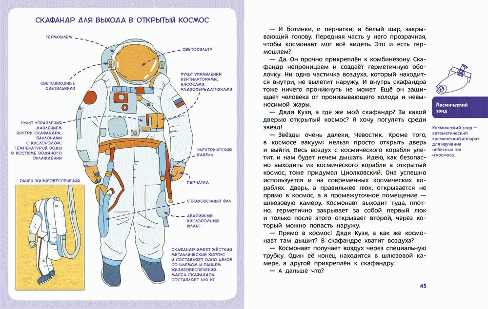 Высокий уровень детализации в иллюстрациях. Читатели смогут рассмотреть устройство Международной космической станции и космодрома Байконур.