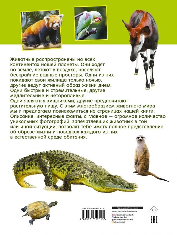 Везде на территории нашей планеты - от раскаленных песков жарких пустынь до закованных во льды полюсов - можно встретить животных. Многие тебе уже, конечно, знакомы: и волк, и лев, и даже азиатский мишка панда, но о некоторых скорее всего, даже не доводилось и слышать. Познакомиться со всем многообразием фауны тебе поможет эта книга. На ее страницах приведены очень интересные статьи, описывающие образ жизни и повадки разных зверей и птиц, но главное - здесь есть большое количество фотографий, благодаря которым ты сможешь рассмотреть во всех подробностях каждое животное в естественной среде обитания.