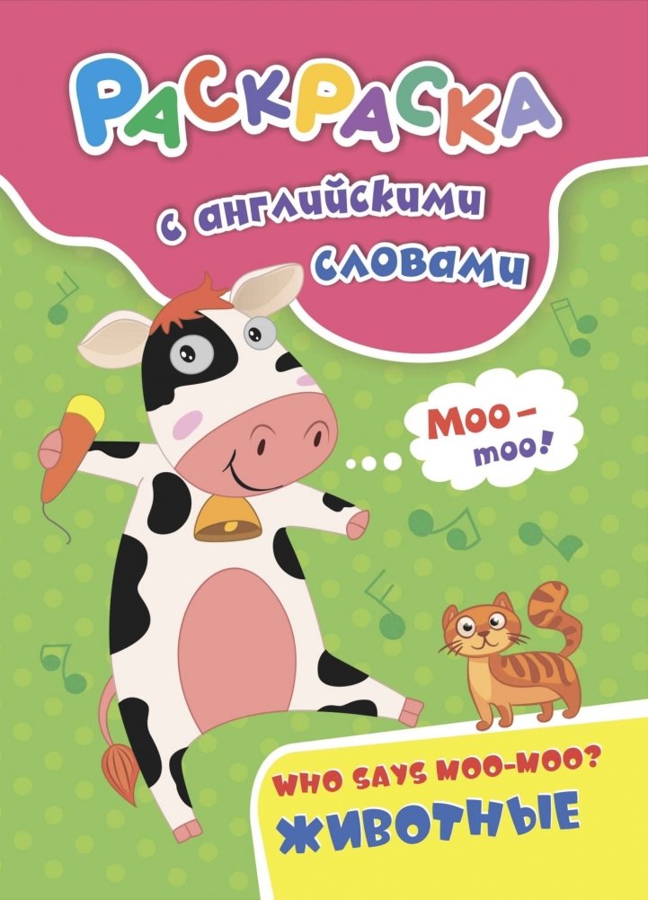 Раскраска с английскими словами "Who says moo-moo?". Животные