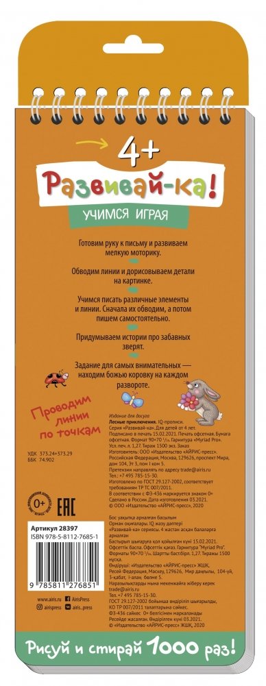 Специальное покрытие страничек позволяет писать и стирать неограниченное количество раз. Можно использовать обычные фломастеры.