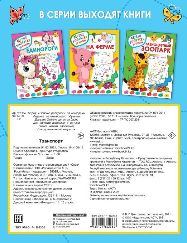 "Транспорт" — замечательная развивающая раскраска. Любознательным малышам обязательно понравится красочная коллекция головоломок и зашифрованных картинок. Предложите ребёнку раскрашивать картинки с числами и примерами на сложение и вычитание, выполнять графические диктанты, решать логические задачки — такие интеллектуальные занятия помогают выучить счёт до 10, расширяют кругозор и словарный запас, формируют графические навыки, развивают мышление, память, внимание, наблюдательность, смекалку и творческие способности. На каждой странице забавные иллюстрации машинок и интересные задания — ребёнок сможет заниматься самостоятельно и с удовольствием.