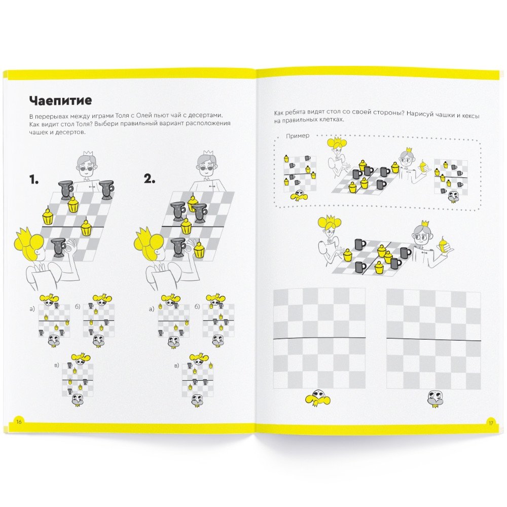 Развиваем: пространственное и алгоритмическое мышление; формальную логику.?Учимся: находить соответствия и закономерности; ориентироваться на шахматной доске. Шахматы начинаются не с шахмат Игра в шахматы — великолепный способ развития интеллекта. Но осваивать ее за строгой шахматной доской для многих детей оказывается не слишком интересным делом. Задача тетрадей «Основы шахмат и логика» — подготовить ребенка к классическим шахматам, которые очень абстрактны для детей до 9–10 лет. Для этого в тетрадях реализована сказочная сюжетная линия и используются ассоциации со знакомыми предметами. Учитесь с увлекательными заданиями Поэтапно, в легком игровом формате дети знакомятся с принципами перемещения фигур и тактикой игры, закрепляют понятия, связанные с ориентацией на шахматной доске. Развиваем пространственное мышление. Развиваем формальную логику, ищем закономерности. Учимся ориентироваться на шахматной доске. Мы приготовили для вас еще кое-что! В тетради вас ждет игра, с которой дети на практике познакомятся с основами тактики и стратегии. Просто вырежьте готовые элементы и играйте весело и с пользой!