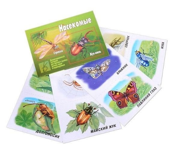В набор входят 12 карт, 24 насекомых: блоха, водомерка, пчела, гусеница, сверчок, муха, стрекоза, колорадский жук, скарабей, саранча, комар, жук-носорог, кузнечик, долгоносик, жук-точильщик, таракан, бражник, павлиний глаз, божья коровка, тля, паук, майский жук, муравей, жук-олень.
