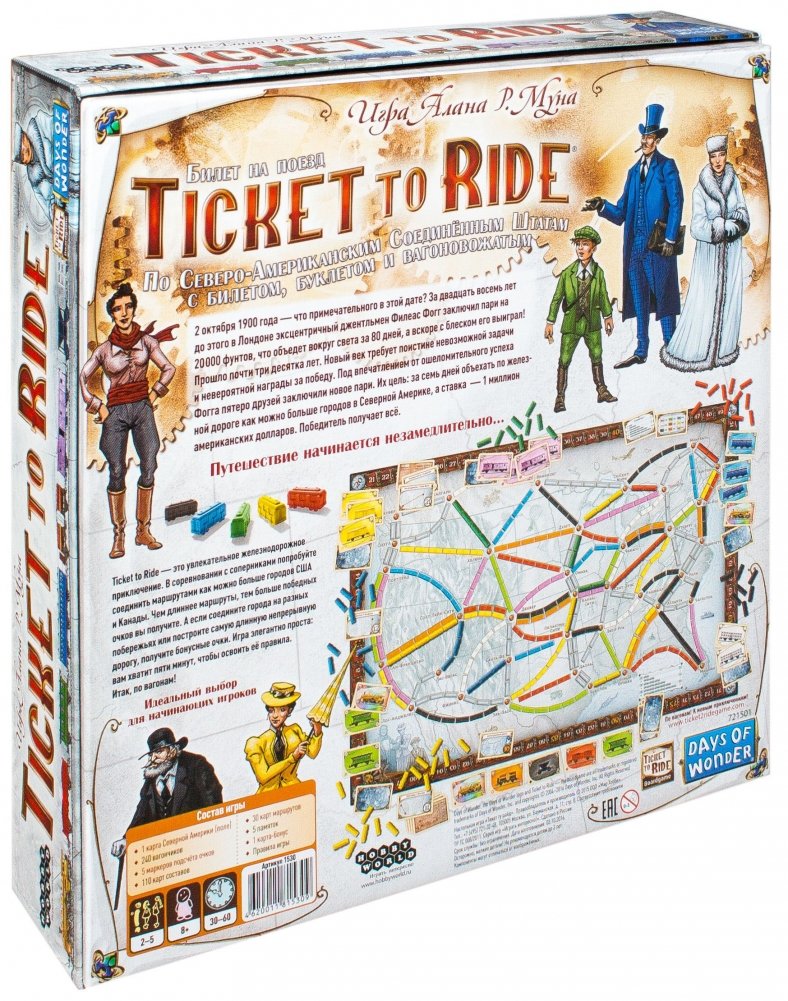 Ticket to Ride — это увлекательное железнодорожное приключение. В соревновании с соперниками попробуйте соединить маршрутами как можно больше городов США и Канады. Чем длиннее маршруты, тем больше победных очков Вы получите. А если соедините города на разных побережьях или построите самую длинную непрерывную дорогу, получите бонусные очки. Игра элегантно проста: вам хватит пяти минут, чтобы освоить её правила. Итак, по вагонам!
