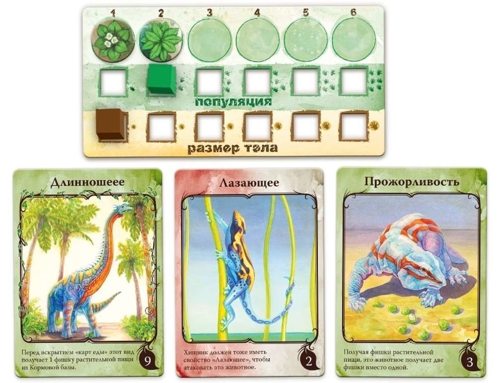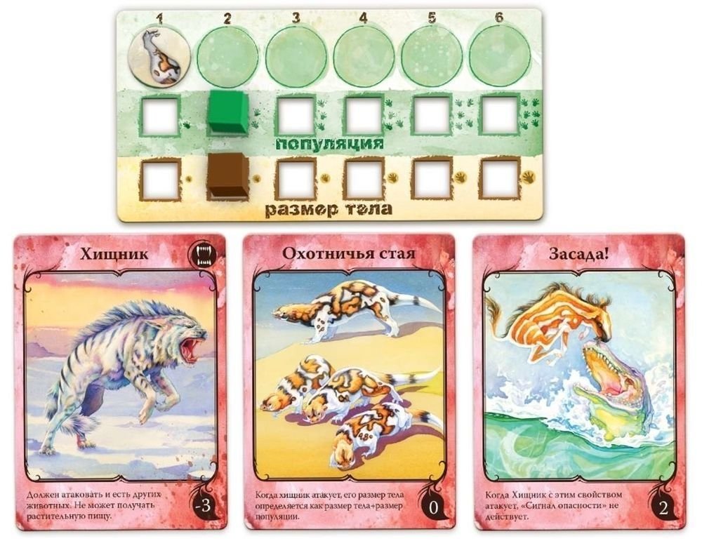 Состав игры: 24 планшета видов животных, 24 коричневых маркера размера тела, 24 зеленых маркера размера популяции, 129 карт свойств животных, 1 поле "Водопой", 180 фишек еды, 6 памяток игроков, 6 мешочков для еды, знак Первого игрока, правила игры.