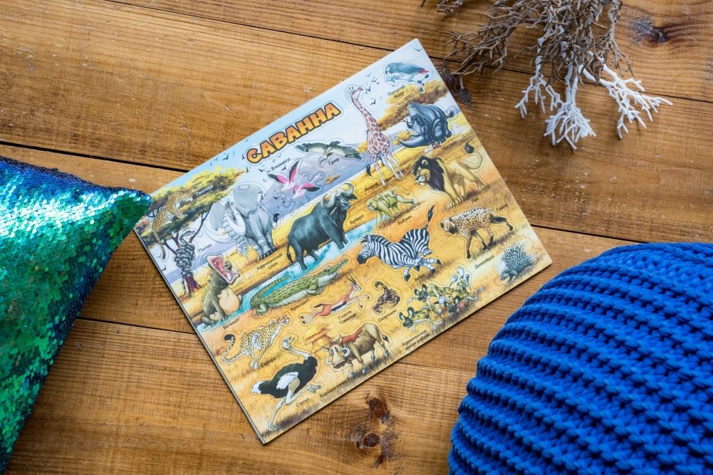 В африканской саванне живут самые необычные животные! Познакомьтесь с ними и узнайте много нового с помощью данного магнитного пазла. Он сделан в ярких тонах, а все животные выполнены в виде красочных рисунков, сочетающих в себе реалистичные изображения и мультипликацию.