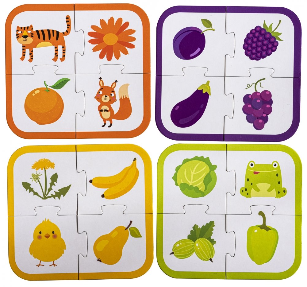 Пазлы «Вот такие цвета» – это увлекательная настольная игра, которая поможет ребёнку запомнить шесть основных цветов: красный, жёлтый, зелёный, синий, оранжевый и фиолетовый. Задача - сложить шесть пазлов разного цвета. Каждый пазл состоит из четырёх картинок, на которых изображены животные и растения. Более сложный вариант игры: собрать с ребёнком тематические пазлы – с животными, овощами, фруктами, ягодами и цветами.