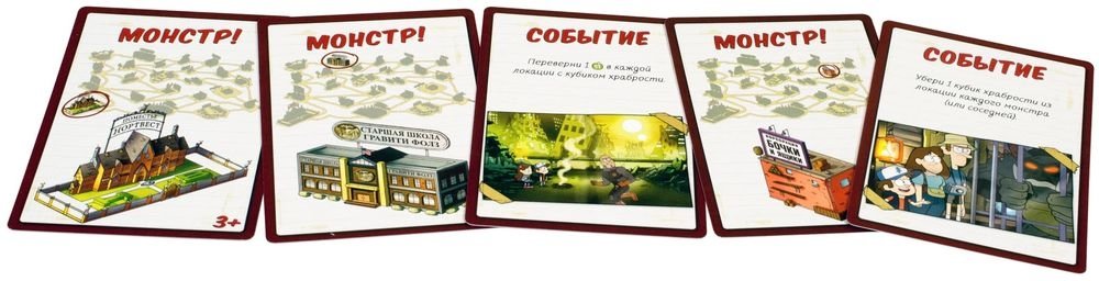 В этой кооперативной игре для 1 – 5 игроков вам предстоит путешествовать по Гравити Фолз, защищать его от монстров и убеждать горожан помочь вам. С каждым ходом от монстров всё больше бед, и доверие к игрокам падает. Чтобы не допустить этого, вам нужно победить их до того, как маркер тревоги достигнет предельного значения.