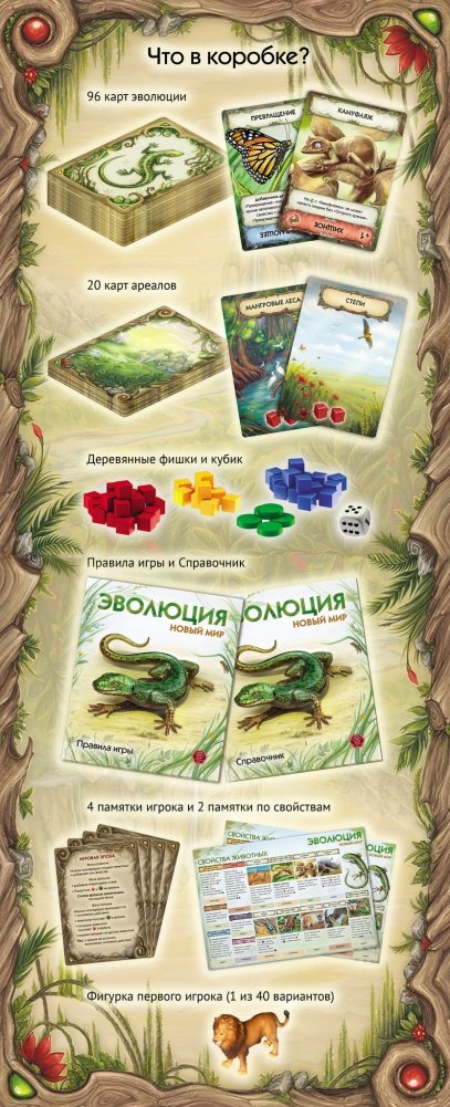 В комплекте: 96 карт эволюции, 20 карт ареалов, кубик, деревянные фишки, правила игры, справочник, 4 памятки игрока, 2 памятки свойств, фигурка первого игрока.