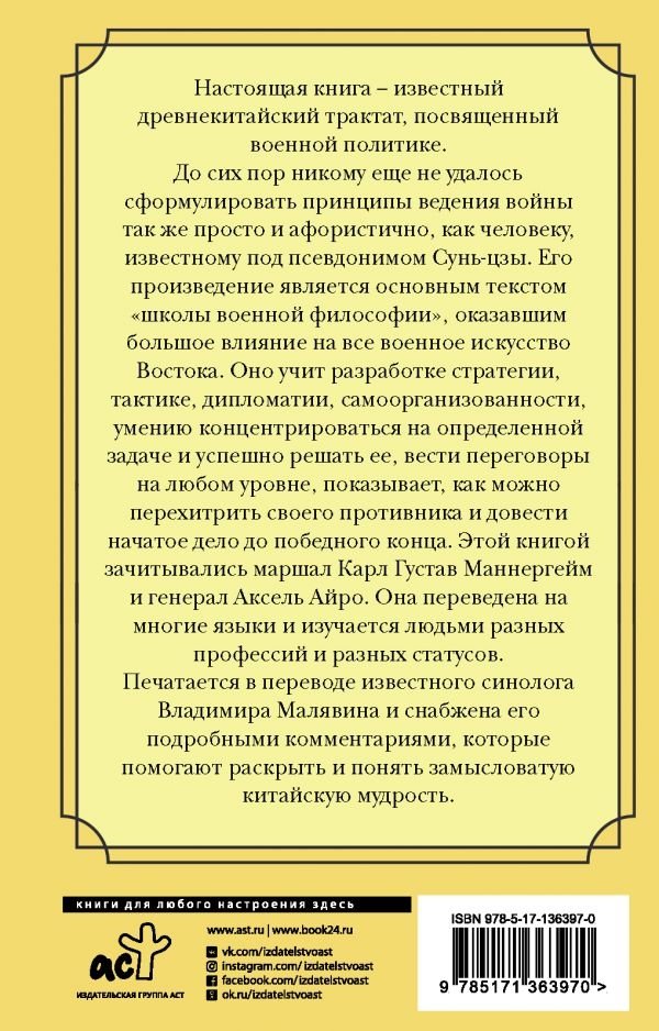 Настоящая книга — известный древнекитайский трактат, посвященный военной политике. До сих пор никому еще не удалось сформулировать принципы ведения войны так же просто и афористично, как человеку, известному под псевдонимом Сунь-цзы. Его произведение является основным текстом «школы военной философии», оказавшим большое влияние на все военное искусство Востока.