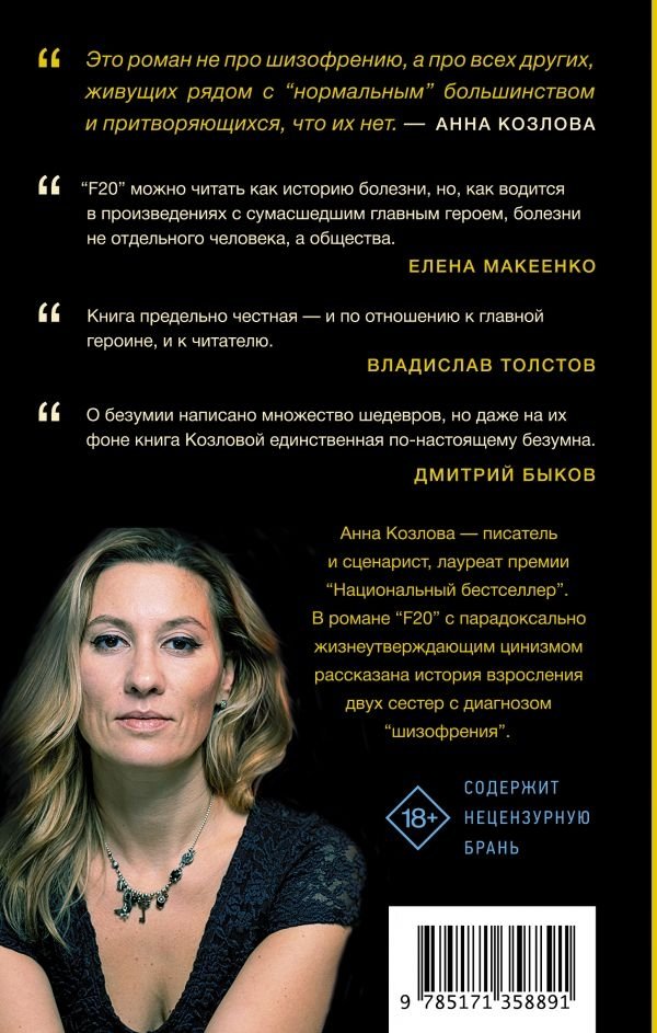В романе Анны Козловой “F20” героиня живет со страшным диагнозом “шизофрения”. Читая этот безжалостный, смешной и глубоко драматичный текст, невольно задаешься вопросом: кого на самом деле стоит считать нормальным. Премия “Национальный бестселлер — 2016”.