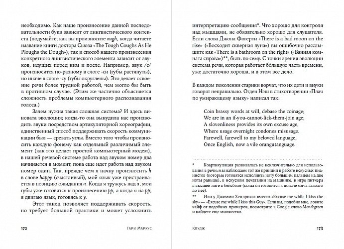 Человек привык считать себя венцом творения, свои сильные стороны — нормой, а слабости — отклонением. Подход автора принципиально другой: мы изначально несовершенны; наш мозг, как и тело, в ходе эволюции формировался достаточно случайно, из «подручных материалов» природы и являет собой так называемый клудж — нелепое, неуклюжее, но удивительно эффективное решение проблемы. Понятие клуджа проливает свет на важные стороны нашей жизни и объясняет множество проблем, с которыми мы сталкиваемся. Выводы автора оптимистичны: имея должное понимание соотношения сил и слабостей человеческого ума, мы получаем возможность помочь не только себе, но и обществу.