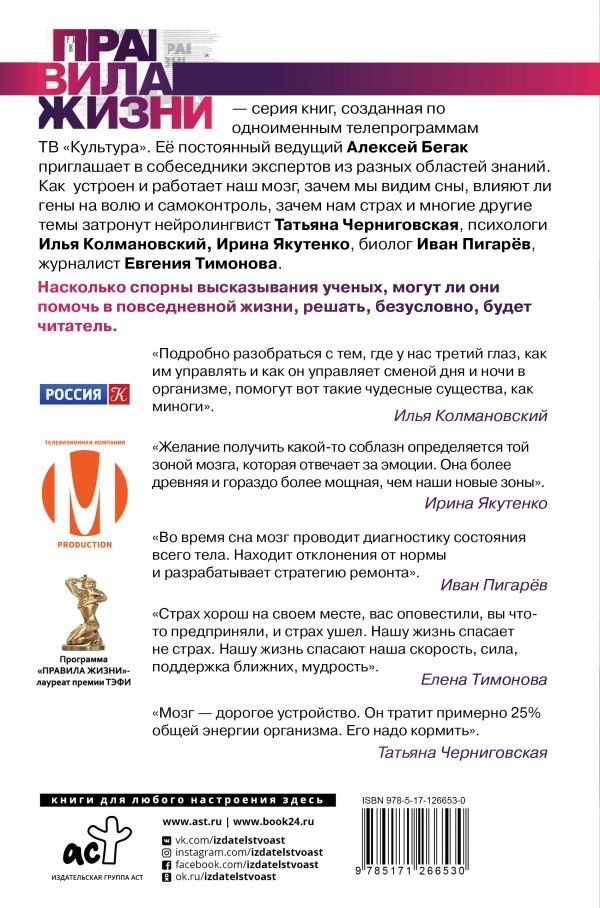 «Правила жизни» — серия книг, созданная по одноименным телепрограммам ТВ «Культура». Её постоянный ведущий Алексей Бегак приглашает в собеседники экспертов из разных областей знаний. Как устроен и работает наш мозг, зачем мы видим сны, влияют ли гены на волю и самоконтроль, зачем нам страх и многие другие темы затронут нейролингвист Татьяна Черниговская, психологи Илья Колмановский, Ирина Якутенко, биолог Иван Пигарёв, журналист Евгения Тимонова. Насколько спорны высказывания ученых, могут ли они помочь в повседневной жизни, решать, безусловно, будет читатель.