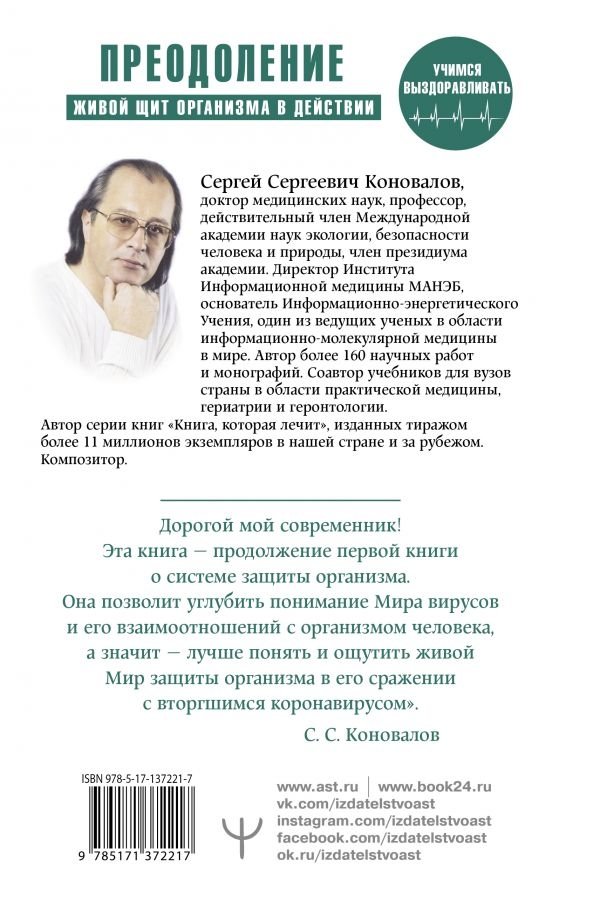 Новая книга доктора медицинских наук, профессора Сергея Сергеевича Коновалова дает читателю возможность расширить понимание происходящих событий, предупредить болезнь, вызванную коронавирусной инфекцией, и сократить время на восстановление, а значит — преодолеть и другие новые угрозы здоровью. Эта книга не только станет для вас добрым помощником в борьбе с коронавирусом, но и в течение многих лет будет сопровождать вас в периоды возникновения угрозы новых вирусных эпидемий.