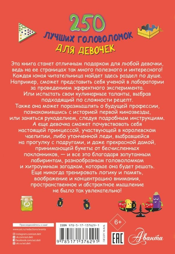 Эта книга - настоящая находка для девочек, ведь в ней столько всего интересного: несложные, но эффективные эксперименты, кулинарные секреты, занимательные факты о моде, театре и кино, подробные инструкции и лайфхаки на разные случаи жизни, а главное - множество хитроумных головоломок и задачек, увлекательных загадок, запутанных лабиринтов и других занимательных заданий. Листая страницы книги, ты узнаешь много нового, повысишь свой интеллект, сможешь развить логическое мышление, внимательность и усидчивость. И при этом, поверь, скучно не будет!